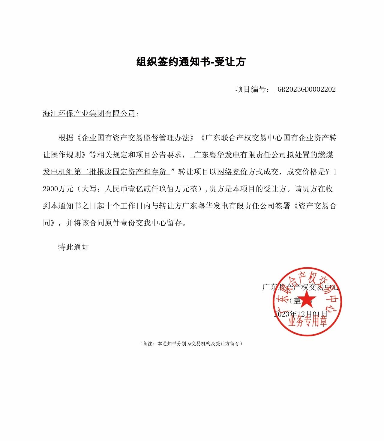 ? ? A?couple of days ago, Ltd., a subsidiary of Beijing Hai Jiang Holding Group, has won the bidding for the disposal project of the second batch of end-of-life fixed assets and inventory of the coal-fired generating units to be disposed by Guangdong Yuehua Power Generation Co. This is another cooperation after the first batch of coal-fired generator end-of-life fixed assets disposal project last year.