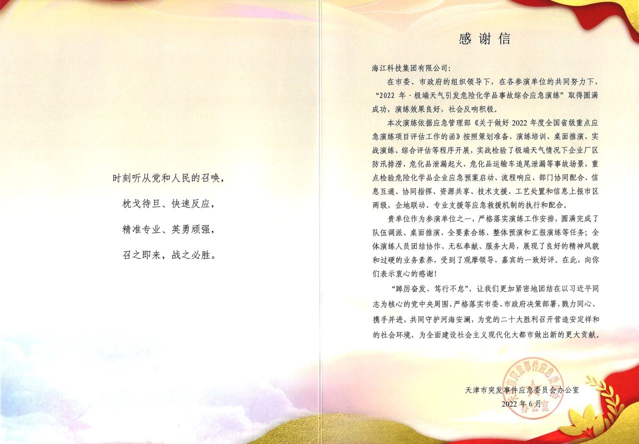 ? ? ? ?On January 15, the rescue team of Haijiang Group participated in the desktop rehearsal of the comprehensive emergency response exercise of hazardous chemical accidents caused by extreme weather, and won the letter of thanks from Tianjin Emergency Response Committee and the honorary trophy of outstanding contribution of 2022 · Comprehensive Emergency Response Exercise of Hazardous Chemical Accidents caused by Extreme Weather.
