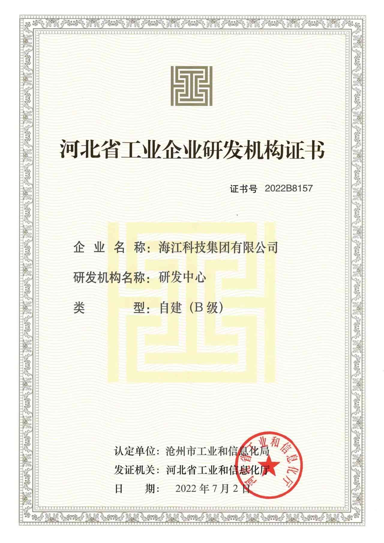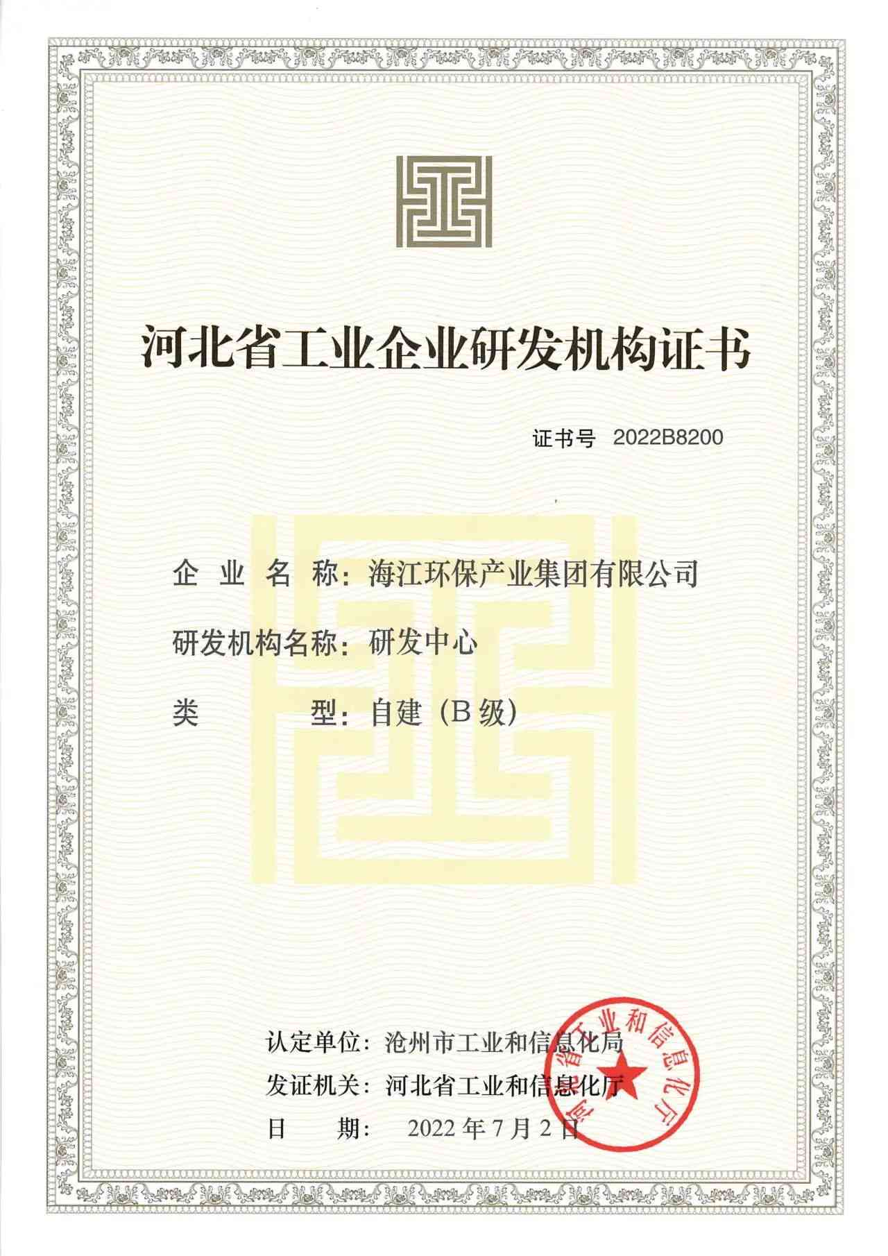 ? ? ? ?On February 28, Haijiang Environmental Protection Industry Group Co., Ltd. and Haijiang Science and Technology Group Co., Ltd. were awarded the certificate of Industrial Enterprise Research and Development Institution (B level) of Hebei Province.