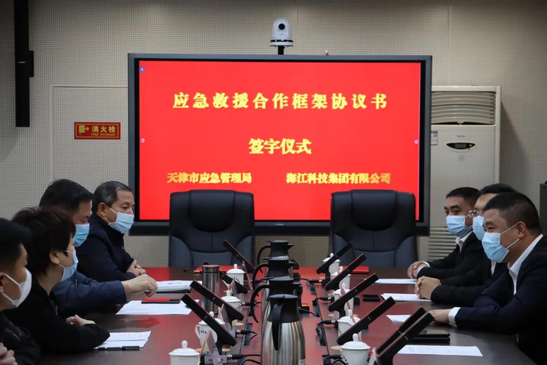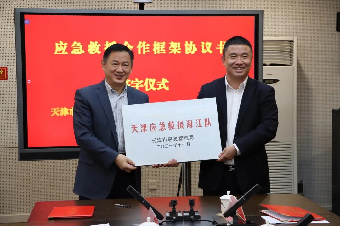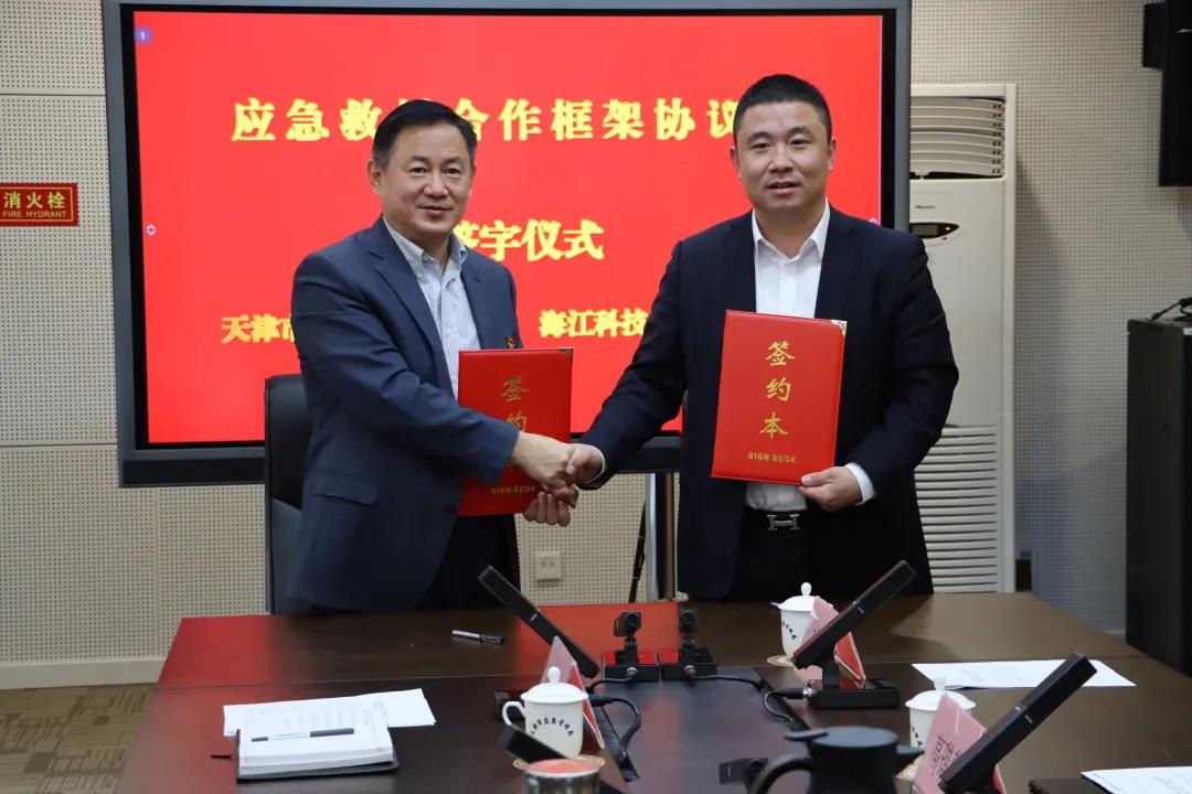 In order to thoroughly implement the important remarks of General Secretary Xi Jinping on emergency management, strengthen the construction of emergency rescue capacity in Tianjin, enhance the emergency response capacity, and effectively protect the lives and properties of the general public, on November 30, Tianjin Emergency Management Bureau and Haijiang Group jointly signed the Framework Agreement on Emergency Rescue Cooperation. Jiao Yong, member of the party committee and deputy director of Tianjin Emergency Management Bureau, and Liu Haijiang, chairman of Haijiang Group, signed on behalf of both parties.