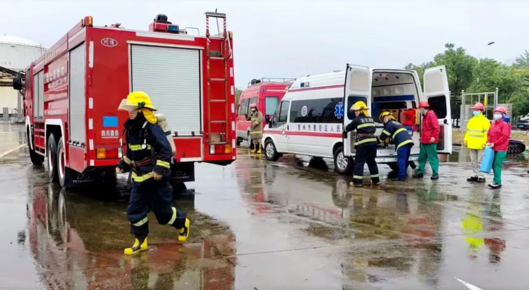The drill was for an accident in which a pipe fitting of the top steel structure suddenly fell and hit the leg of a construction worker at the site during the dismantling operation of the light hydrocarbon separation loading station. The on-site supervisor immediately went up to observe the injured person's injury and reported the site situation to the engineer department manager after finding the injury. At the same time, he called 119 to notify the company's fire department and medical team to arrive at the accident site.