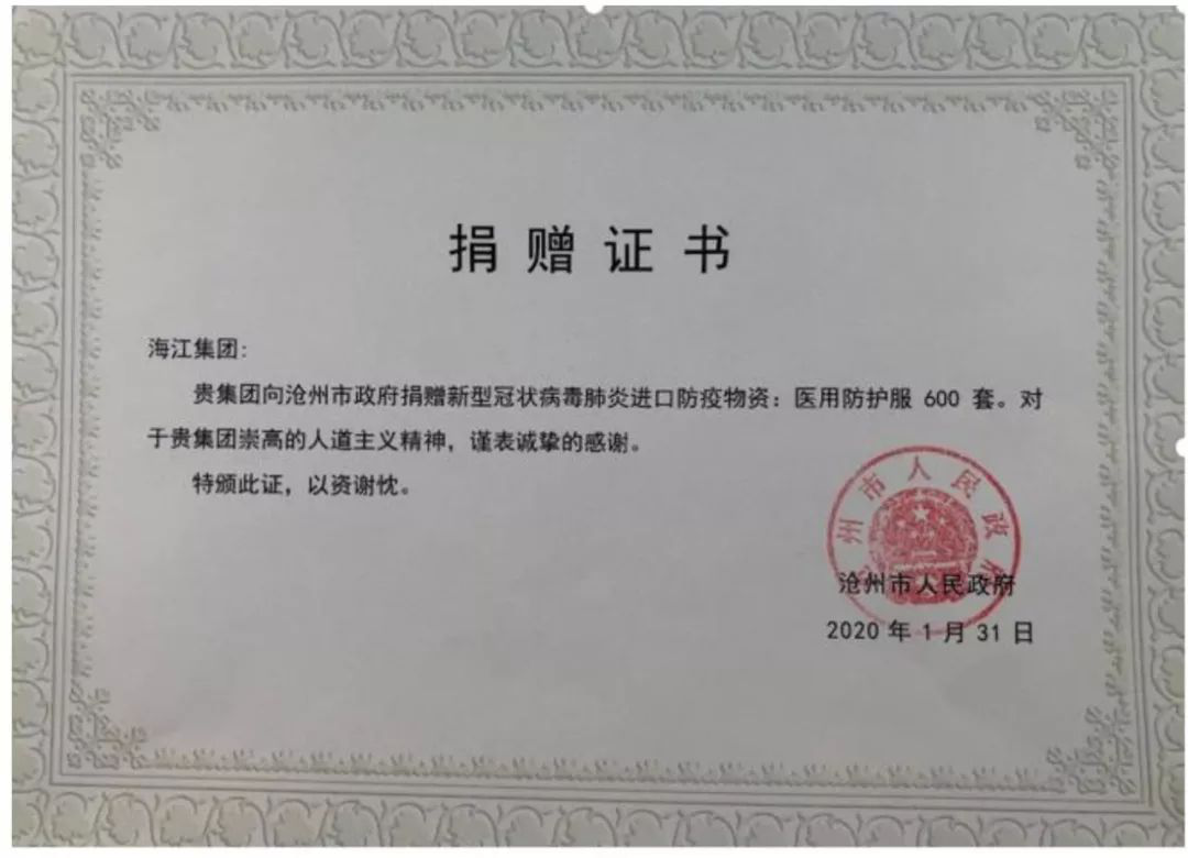 近期,湖北省武漢市等多個地區(qū)發(fā)生新型冠狀病毒肺炎疫情,牽動著全國人民和海江人的心。在 1 月 25日(農(nóng)歷大年初一)召開的中央政治局常委會上,習近平總書記再次強調:“生命重于泰山,疫情就是命令,防控就是責任。”在這場突如其來的疫情面前,人人守土有責,海江集團不忘初心使命與社會責任!“心系家鄉(xiāng),全力支援,抗擊疫情”在國內防疫醫(yī)療物資緊缺的情況下, 委托“滄州外經(jīng)”在國外加急采購一批進口醫(yī)療物資,無償捐助滄州市政府,為我市抗擊新型肺炎工作提供堅實屏障。