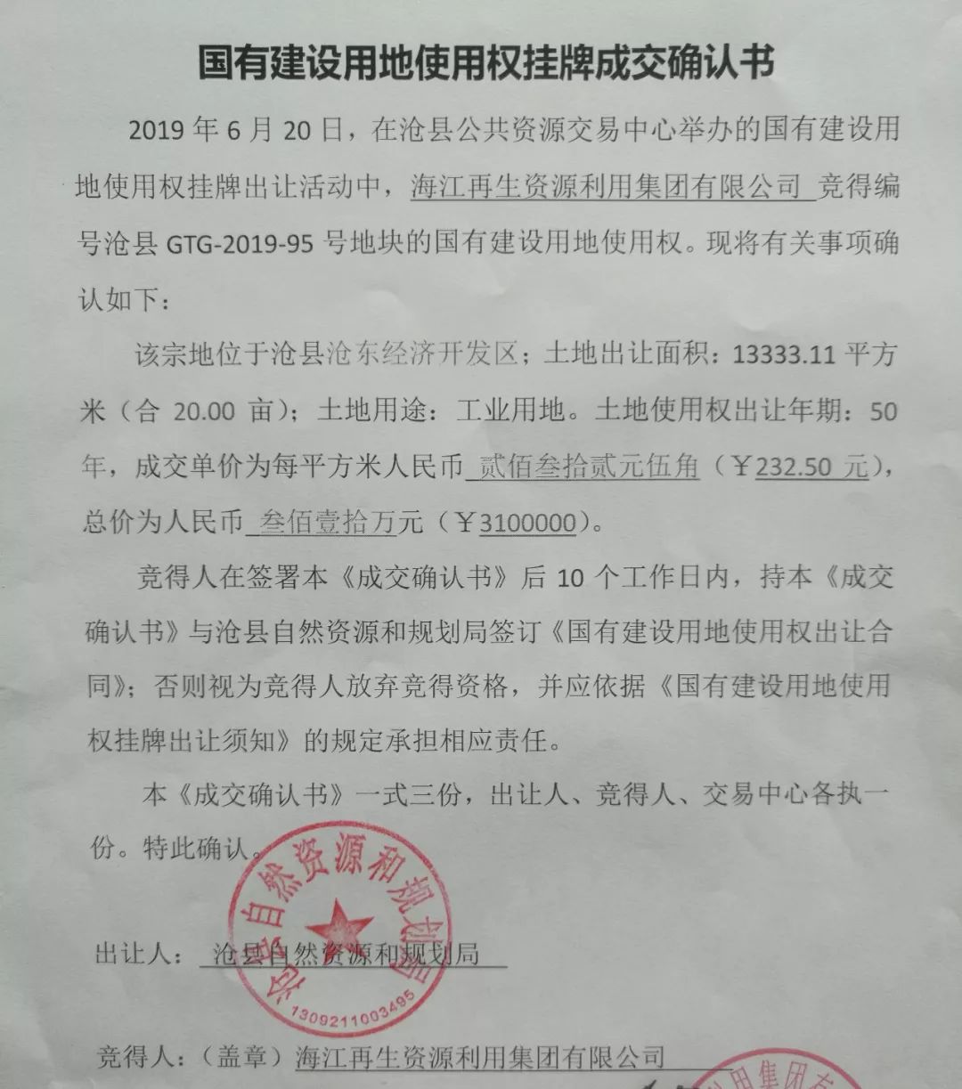 ? ? 2019年6月20日上午,在滄縣公共資源交易中心舉辦的國有建設用地使用權掛牌出讓活動中,海江集團成功競得滄縣GTG-2019-95號地塊的國有建設用地使用權。