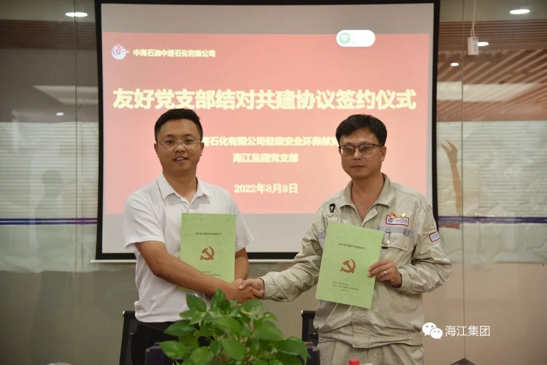 交流完畢,海江集團黨支部與中海中捷石化健康安全環保部黨支部共同簽署《友好黨支部結對共建協議書》。未來雙方將強化交流合作,攜手構建相互借鑒、相互提高、共建共贏的良好局面,全面提高黨建工作水平。